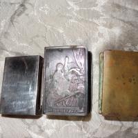The second match box cover measures 1 – 13/16” in height and is 1.25” in widthThis cover features two engraved designs; on 1 side Jan Steen is shown playing a mandolin while on the opposite side Rembrandt is depicted. We believe that the material used in the creation of this box is sterling silver but we cannot find any markings and are not sure. There is a fair amount detail present on this piece and we rate this piece as being in very good condition.