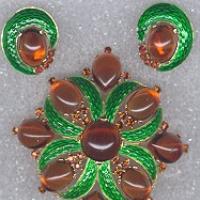 Among the best of Trifari, this set sports rich and luminous topaz-colored oval glass cabochons around a central round cabochon that measures 5/8" across to create an important costume jewelry statement. Curved "arms" of bright green enamel over textured goldtone metal are punctuated with faceted roundstones in a honeyed topaz tone. We can only wonder whether the designer had been viewing a kaleidoscope before drawing this pin. It is so exciting for such symmetrical design! The matching earrings are clips that measure 1-1/8" X 7/8". All pieces are signed "Trifari". (#13133-H580-TrifCbSt) To order this beautiful vintage Trifari pin and earrings set, just email us at: Adon13@aol.com