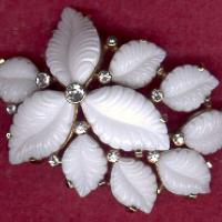 You will be impressed with the quality of this fine, old Jomas pin with varying sizes of prong-set, glass fruit salad type leaves and lovely bezel-set roundstones. We hope you will be able to get an idea of how beautiful these molded glass leaves truly are. The pin measures approximately 2-1/4" X 1-1/2" and has a safety closure. The Jomaz signature is impressed into the metal on the reverse of the pin. In Excellent Condition, we feel this is a terrific find! (#14932-H853-JomazLef) To order this pin, just click on the blue shopping cart button to the left of the picture, or email us at: Adon13@aol.com or telephone us at 773-929-9007 or fax us at 773-525-1920.