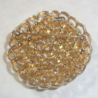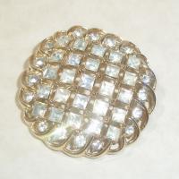 This Trifari brooch is approximately 2" in diameter and is done with openwork crystal rhinestone squares with chatons all around the rim. Metalwork is goldtone. Trifari copyright mark on the back. Good condition. A real sparkler.