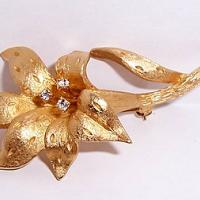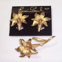 Still in the original black velvet box with card bearing information on the designer. These are gorgeous brushed goldtone 2-1/2" brooch and matching clip on earrings. They are softly textured with rhinestone accents. All pieces are signed. Elegance and class for daytime or evening.