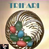 Gracefully swirling and domed, this beautiful Trifari vintage pin features authentic-looking cabochons of faux coral, turquoise and jade accented with tiny crystal faceted sparkling rhinestones. There are two curves on the upper right that are lined with tiny clear crystal rhinestones to balance the design. The pin measures approximately 1-5/8" round, has a safety closure and is signed "Trifari" with a copyright symbol impressed lightly into the metal on the reverse of the piece. It is in Excellent Condition. A fine example of Trifari's artistry in vintage costume jewelry. (#17258-J796-VintageTrifariFauxJadeCoralTurquoiseCabochonRhinestonePin) To order this beautiful vintage Trifari pin, just click on the blue shopping cart button to the left of the picture, or email us at: Adon13@aol.com or telephone us at 773-929-9007 or fax us at 773-525-1920.