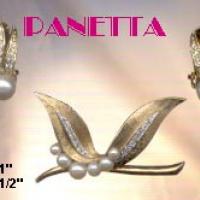 An elegant and well-bred look, this expertly crafted vintage pearl, goldtone and clear rhinestone set could easily pass for precious jewelry. It is signed, "Panetta" with a copyright symbol, on a signature cartouche impressed into the reverse of the pin --a rare signature in vintage costume jewelry. The earrings, although clearly a match and acquired together from the same estate are unsigned. The pin measures approximately 2 x 1" and the earrings measure approximately 1 x 1/2". You will be impressed with the fine craftsmanship of this lovely set. (#18176-K047-VintagePanettaPinEarringsSet)