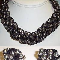 1" wide woven glass beads and silvery gray pearls put this necklace right in style. 15-1/2" including extender chain. Hook closure and matching 1" clip on earrings. Day into evening with this set !