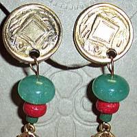 Very pretty earrings in clip on style - ethnic design with antiqued goldtone finish, green and coral composition beads. These earrings are signed on plaques "deja" in script. Quality workmanship and design. I'm not familiar with this designer and at first thought they were "Reja".