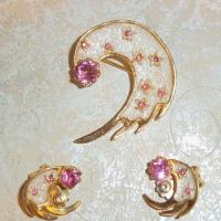 Unique set features a star and milky way motif with pink rhinestones and goldtone base. Textured white enamel sets this set apart ! Brooch is 2" and clip on matching earrings are 1".