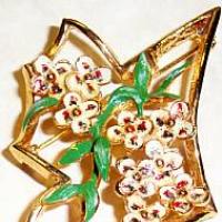 Nice early Hattie Carnegie piece in neutral enamel floral on goldtone freeform background. Signed on back .