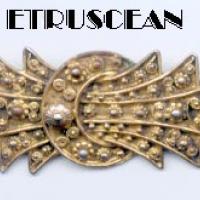 After the Etruscan jewelry of the 8th and 7th Century AD, this stunning Mid 20th Century pin mimics the ancient metalworking expertise of the Etruscans. This costume jewelry pin illustrates the ornate filigree, beading and granulation techniques popular in ancient jewelry. The pin measures approximately 3 x 1-1/4" and has a safety closure. It is signed, "Etruscean" very faintly on the reverse of the pin. In Very Good/Excellent Condition, we think the metal finish on the pin was supposed to be antiqued and reflect the look of an aged high karat content piece of buried treasure from an archaeological dig and it really does! (#19408-K640-EtrusceanPin)To order this beautiful vintage Etruscean pin, just click on the blue shopping cart button to the left of the picture, or email us at: Adon13@aol.com or telephone us at 773-929-9007 or fax us at 773-525-1920.