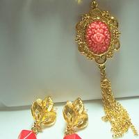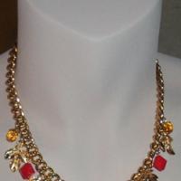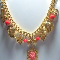 Fabulous charm necklace by Sarah Coventry - newer production but same quality in construction and design. This has a great goldtone chain 18" with foldover clasp. Features golden leaves, faux coral beads and a floral molded drop with tassel (4") in the front. The drop is removeable for an entirely different look. See the matching bracelet listing !