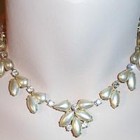 This is an unusual faux pearl necklace in that the pearls are "prong set" instead of the usual beads. Each grouping of two is accented by rhinestones. Hook clasp in back and an extender chain could be added, if desired. Beautiful for a June wedding.