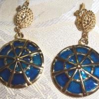 Pretty pair of goldtone stained glass style drop earrings by Trifari are about 2" overall. They are clipon style, goldtone. The blue enameling is translucent letting the light shine through like stained glass windows. Very pretty.