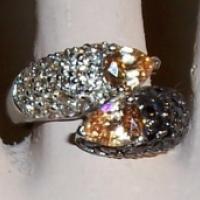 Beautiful Sterling CZ Ring with champagne color cz teardrops combined with pave set black and crystal cz's.