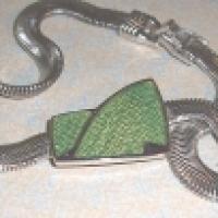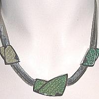 Classy silvertone necklace featuring art moderne plaque designs with textured enameling. Necklace is a little over 16" with nice foldover clasp signed Trifari. Look for the matching bracelet listed in our main catalog.