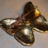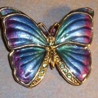 A beautifully colored luminescent enamel for this butterfly. Goldtone base with rhinestone accents. About 2" wingspread. Signed and numbered on the back but difficult to read. SFJ ? A great addition to your collection and just begging to be worn !