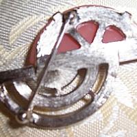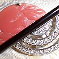 Art Deco style brooch is contemporary designed by Jones New York ! Beautiful shape with pink acrylic carving, black enamel and pave set crystal rhinestones. Silvertone base about 2".