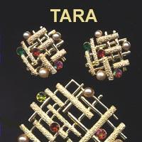Tara pin and earrings set is fresh from an estate where it was found near mint with its original tag and has probably never been worn. The beautiful modern design features an open cross-hatch of shiny and granulated goldtone bars sprinkled with rhinestones in red, emerald green, olive and Aurora Borealis red with luminous simulated pearls. The pin measures approximately 2-1/4 x 2-1/8" with a safety closure. The matching earrings measure approximately 1 x 1" and have comfortable wire clips. The pin and earrings are both marked "Tara" impressed into the reverse of the castings. A beautiful vintage Tara pin and earrings set in Near Mint Condition with the original tag. (#21474-K730-TaraPinEarringsSetNearMint) To order this Vintage Tara Pin & Earrings Set, just click on the blue shopping cart button to the left of the picture, or email us at: Adon13@aol.com or telephone us at 773-929-9007 or fax us at 773-525-1920.