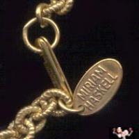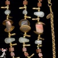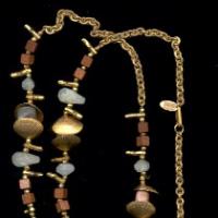 Miriam Haskell necklace is a long Russian goldtone chain with stations of golden clamshells, twigs and beads alternating with translucent faux quartz nuggets, genuine abalone and square wooden beads. The necklace dates Ca. 1960 and measures approximately 38" -- perfect for today's hot l-o-n-g chain necklaces with bead stations. The necklace is in Excellent Condition and has the Miriam Haskell signed slide clasp as well as her oval signature tag with embossed letters "Miriam Haskell". A great, wearable-today, fashion look in a very collectible vintage Miriam Haskell necklace! (Price includes domestic UPS Ground shipping.) (#21479-K735-MiriamHaskellNecklaceShells) To order this Vintage Miriam Haskell Necklace, just click on the blue shopping cart button to the left of the picture, or email us at: