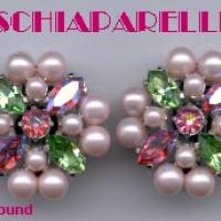 Schiaparelli earrings are a dreamy confection of pale pink simulated pearls in two sizes and Aurora Borealis pink and mint green navette rhinestones that are prong-set in silvertone metal. The earrings measure approximately 1-1/4" round and are in Excellent Condition. They are signed "Schiaparelli" in script on each of the ear clips. The clips are sturdy and secure and retain their original tension. These are rare beauties! (#21564-K764-Ear167) To order these beautiful vintage Schiaparelli earrings, just click on the blue shopping cart button to the left of the picture, or email us at:
