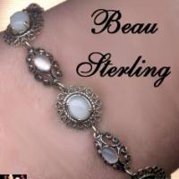 Beau Sterling bracelet has nine gorgeous moonstones set in sterling silver filigree. Gemstone lore says that moonstones help balance the emotions, bring success in love and business matters and can reunite lovers who have quarreled. T his beautiful bracelet measures approximately 7-1/4 x 1/2" and has a safety chain and foldover clasp. It is signed "Beau Sterling" impressed into one of the rings on the bracelet. The Beau or Beaucraft Company closed their doors in 2004, but they produced jewelry since 1947 and it has been collected and photographed in books on collectible costume jewelry for years. We estimate this bracelet to date to Ca. 1960 based on the estate it came from. It is in Excellent Condition Alone and you will enjoy wearing this vintage Beau moonstone and sterling bracelet. (21628-K792-BeauSterlingMoonstoneBracelet) To order this Vintage Beau Sterling & Moonstone Bracelet, just click on the blue shopping cart button to the left of the picture, or email us at: Adon13@aol.com or telephone us at 773-929-9007 or fax us at 773-525-1920.
