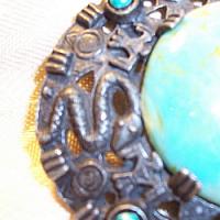 Fabulous designed brooch with a lot of Southwestern flair or insignia, but I do not know its origin. It is vintage and features a framework with snakes, arrows, shields, thunderbirds and other typical Southwestern markings. Remarkable detail ! There is a large round turquoise glass stone in the center with smaller blue stones around the edge. These may have been replaced at some time.