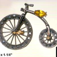 Bicycle pin in darkened silvertone metal with hematite rhinestones lining the moveable wheels that actually spin is accented with a golden topaz navette rhinestone seat and Light Colorado Topaz colored rhinestones at the center of the wheels. The front wheel has a navette rhinestone and the rear wheel has a round rhinestone center. This handsome bicycle pin has a sophisticated color palette and reminds us of Judith Jack's palettes or vintage marcasites. The pin measures approximately 1-1/2 x 1-1/4" and has a safety closure. Casual or dressy, this charming bicycle pin will take you anywhere you want to go! (#23302-L660-BicyclePinRhinestoneMoveableTopaz) To order this Moveable Bicycle Pin, just click the blue button to the left of the picture to access our secure online shopping cart or email us at: Adon13@aol.com or telephone us at 773-929-9007 or fax us at 773-525-1920.