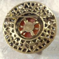 This is a beautiful brooch - antiqued goldtone Etruscan design with several different stones, including coral and large carnelian ? stone with smaller stone cameo accent. Quality construction and very different ! Lots of design and dimension.