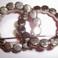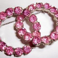 Very pretty pink rhinestone double circle brooch by Weiss. Silvertone base metal. 2-1/4" x 1-1/4". Nice vintage Weiss ! All of the rhinestones look original and good.