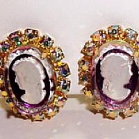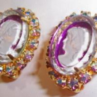 These are sparkly and beautiful earrings by Tara. About 1" these glass cameos are under a thick glass dome and surrounded by aurora borealis rhinestones. They are clip on style in goldtone. Very pretty.