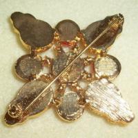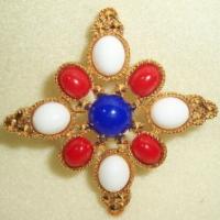 Very pretty goldtone cross by Sarah Coventry features the Red, White and Blue - American Flag Colors in the form of glass cabochons all bezel set in an attractive goldtone setting. Brooch is 2-3/4" and in very good condition.