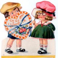 Large Carrington Co. mechanical valentine has two children darling children that look like the Campbell's soup kids, the little boy presenting a huge heart that says, "To my dear Valentine" and the little girl peering through one-handled spectacles with her arm crooked at her hip that moves the arm and changes the postition of the eyes forward and away. The colors are vibrant and the Valentine measures approximately 8 x 6-3/8". The verse says, "Just gaze at this and you will see, How much I think of thee,/The biggest heart I could find,/ I've brought it to my Valentine." In Very Good/Excellent Condition, there is a slight smudge on the last line of the front of the verse and two long scratches that can only be seen on close examination when it is tilted in the light. The Valentine is unsigned and has an easel on the back so that it can stand. The front has a circular stamp on the bottom right of the illustration that says "Louis Katz and something illegible and 1924 around a large C (presumably for Carrington Co.). Opposite that, it says, "Made in Saxony". On the back is the Carrington Co. mark with a tree around the letter, "G" (shown). Really terrific image, large size and great condition make this one to have in your collection! (#26213-MechanicalValentineCarringtonCo) To order this charming Vintage Valentine, just click on the blue shopping cart button to the left of the picture, or email us at: Adon13@aol.com or telephone us at 773-929-9007 or fax us at 773-525-1920.