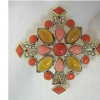 Signed Corals & Honey Marcasite Maltese Cross Brooch / Pin