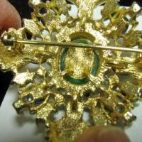 So very dainty and pretty in an intricate design loaded with clear rhinestones, and blue and green cabs all in gold tone. The back is all shiny with a good working stem and safety. In very good condition. Not signed but should be.