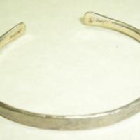 This is a single 1/4" wide open bangle bracelet with a hand hammered design. It is signed sterling on one end and the other end has a script signature that I have been unable to identify. Quality piece done in the arts and crafts style. This would look great on its own or mixed with your other jewelry.