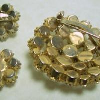 This is a nice set, just in style - black and white. This set is all white faceted rhinestones set in goldtone. The brooch is about 1-1/2" in diameter and is slightly domed, The earrings are clip on style and 1/2". Good condition.