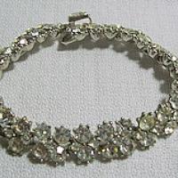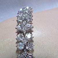An older signed Trifari bracelet still sparkles ! Two rows of rhinestone chatons with smaller rhinestone accents and set in silvertone. The foldover clasp is signed Trifari. Bracelet is just over 7" long x 3/8" wide.