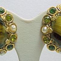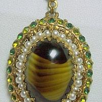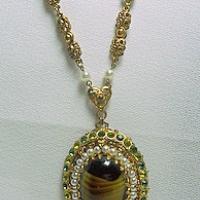 A fabulous set made in West Germany features a 26" textured chain with heart shaped bale holding a 2" pendant. Goldtone filigree with olivene rhinestones and faux pearls encircling an art glass swirl glass stone. The swirls inside actually seem to move with the pendant ! The matching 1" earrings are clip on style and are signed West Germany. This is a set you will treasure and wear often.