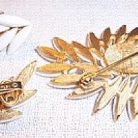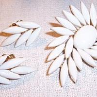 A very nice set by Trifari featuring long slender white glass navettes surrounding a white cabochon. Just over 2". The matching earrings are 1-1/8" and are clip on style. The ideal "perk up" for that dark suite !