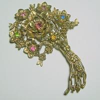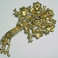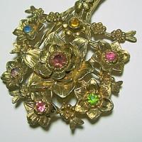 This large brooch is signed LN/25 for Little Nemo. Brooch is almost 4" high with an openwork bouquet of goldtone flowers with pastel rhinestone centers. I believe the rhinestones are original and the brooch has a nice patina and is in good condition. Very pretty.