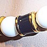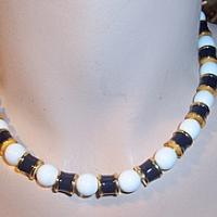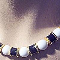 St. John necklace features white glass beads alternating with navy blue and goldtone enamel "spool" beads for a classic look. 16" length with toggle clasp. Hang tag and paper tag still intact. The navy blue beads in this look almost black until the light hits. Very nice. A necklace that will give you a lot of wear - classic enough for daytime yet elegant enough for evening.