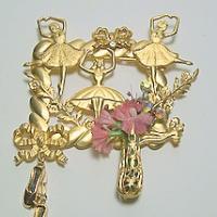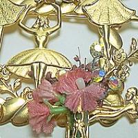 Just for the dancer ! A large 3" goldtone brooch featuring 3 ballerinas in a garden with rhinestone accents. Tiny bow at the bottom holds a pair of ballet shoes and a filigree bouquet on the other side holds silk flowers and rhinestones for the excellent performance. I believe this is an older Kirks Folly no longer available.