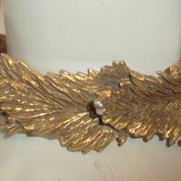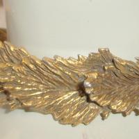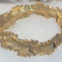 Hinged cuff bracelet by Vogue features 1/2" of layered leaves to encircle your wrist ! Antique goldtone. Back is hinged with open front each side meeting in the center. Signed in a cartouche inside the bracelet. Slight wear inside. A very nice detailed bracelet with good design and construction