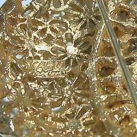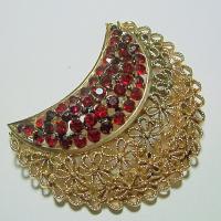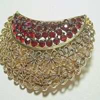 Very pretty brooch by Karu Arke Co. featuring openwork floral design 2" with red rhinestone accents. Signed on the back Karu Arke Co. Some slight wear to the goldtone but a nice brooch !