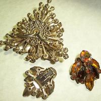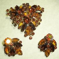 Bright sparkling rhinestones are a hallmark of Judy Lee jewelry and this is no exception. Perfect for Fall - this 2-1/2" brooch features navettes and chatons in shades of smoky topaz and amber. The earrings are clip on style and measure 1-1/2". All set in goldtone.