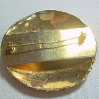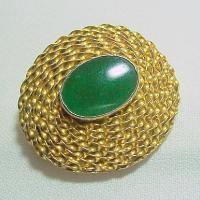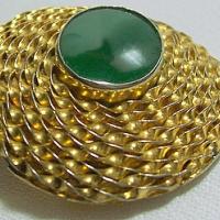Signed Italy, this vintage brooch features a wide rope twist frame surrounding a jade green bezel set stone. Difficult to tell whether this is genuine jade, but the brooch is quality made. It measures approximately 2-1/4" oval and has concave reinforced back with safety clasp. A very classic look.