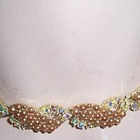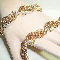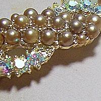 Vintage Kramer set makes lavish use of champagne beige faux pearls and sparkling ab rhinestones in this 15" x 1/2" goldtone necklace. Matching bracelet is 7".