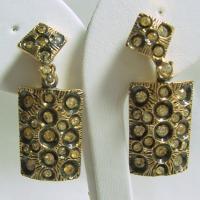 These unusual earrings are by Kafin, New York. They are drop style from clips and feature a textured rectangular drop with deeply set rhinestones in a pale gold crystal. It reminds me of pictures of the moonscape ! They measure about 1-3/4" top to bottom. These look great on - very face flattering.