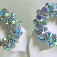 I believe these brooches may be unsigned Weiss. They both came from the same estate. Sparkling blue AB rhinestone chatons in two sizes make up these circle brooches. They measure 1-3/4" in diameter. The colors in these are unbelievable. Set in silvertone. You can buy them each for $22.00 or buy both for $40.00.