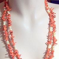 Recall the beauties of the sea with this fabulous 56" vintage necklace featuring red coral branches and freshwater pearls. A duo of two pearls are spaced evenly throughout the coral branch necklace. This does have a goldtone filigree clasp at the back so versatility is available.