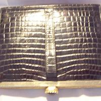 This is a faux black alligator purse 8 x 6-1/4" clutch style with the hand strap on one side. Beautiful engraved goldtone frame with black cabochon stones. Opens to black satin lining with single side zip pocket. You will notice that there are 3 spaces for cabochons at the clasp - the spaces are enameled black, I believe because the clasp is there and for stones to be present would not be practical. In other words, it is made that way. Very nice useable condition.