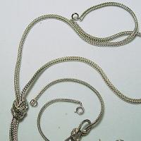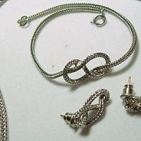 Always top of the line, this classic set is by Hobe. The necklace is silvertone chain measuring 20" with a single knot design (does not slide). The matching bracelet is 7-1/4" and the 1/2" earrings are pierced style. If you want a quality set for everyday style, this is it !